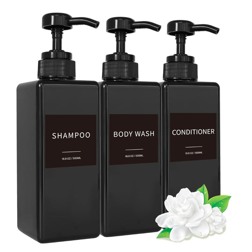 - Package Include: This shampoo dispenser set includes 3 thickened black plastic bathroom shower dispensers, 6 pcs waterproof labels and a silicone funnel to assist refill liquid.