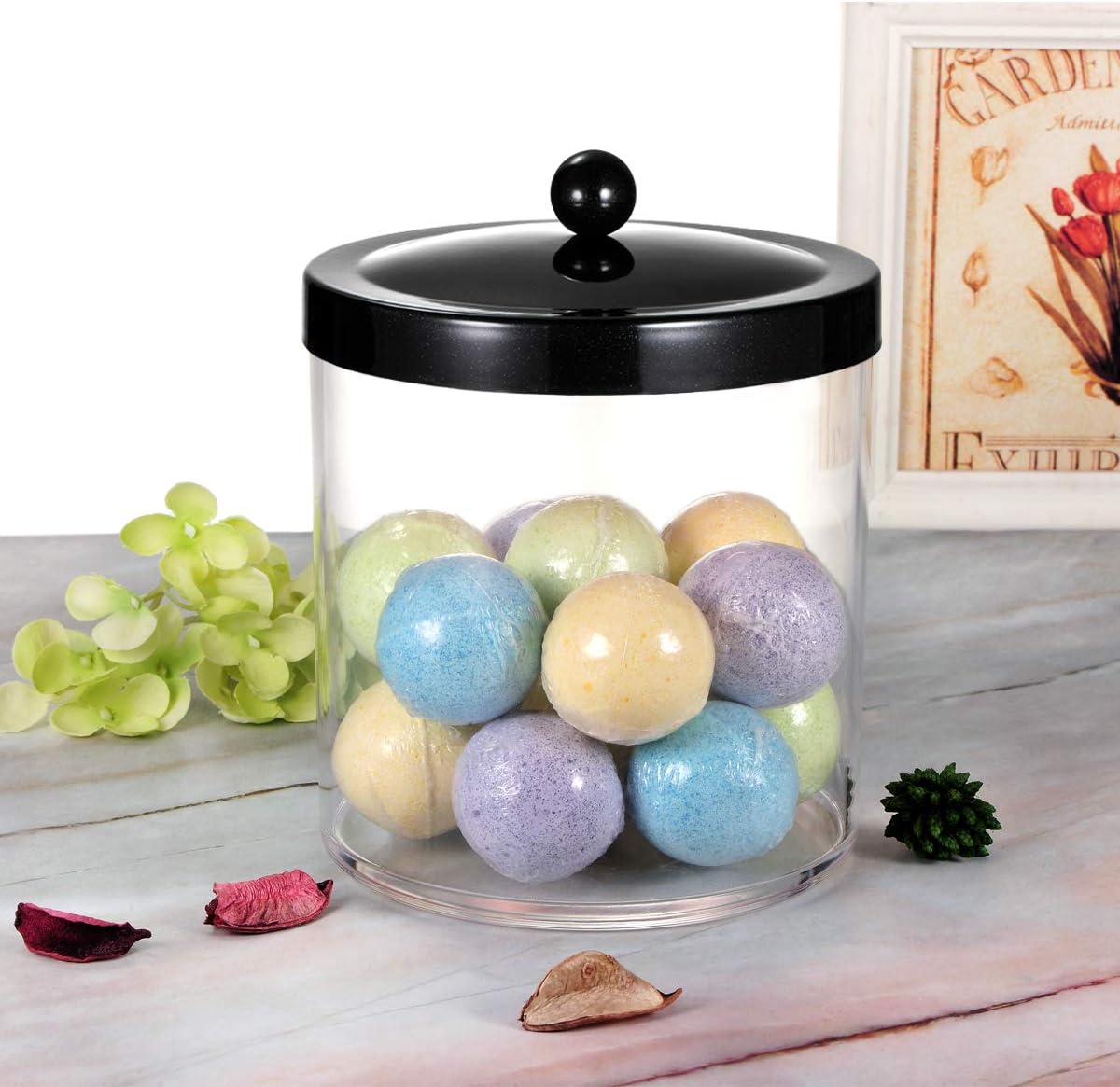 - ✅[LARGE CAPACITY SPECIFICATIONS] Measuring 5″ diameter by 6.7″ height. This 50oz jar holds approximately 10-13 golf-ball sized shower bombs or 2-4 jumbo Lush bath bombs. Versatile enough for apartments, RVs, and campers where style meets functionality.